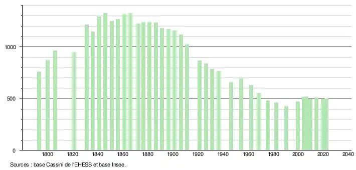 L'évolution du nombre d'habitants est connue à travers les recensements de la population effectués dans la commune depuis 1793. Pour les communes de moins de 10 000 habitants, une enquête de recensement portant sur toute la population est réalisée tous les cinq ans, les populations de référence des années intermédiaires étant quant à elles estimées par interpolation ou extrapolation[16]. Pour la commune, le premier recensement exhaustif entrant dans le cadre du nouveau dispositif a été réalisé en 2004[17].