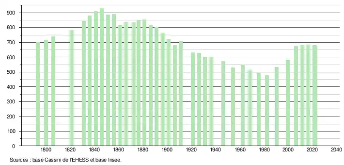 L'évolution du nombre d'habitants est connue à travers les recensements de la population effectués dans la commune depuis 1793. Pour les communes de moins de 10 000 habitants, une enquête de recensement portant sur toute la population est réalisée tous les cinq ans, les populations de référence des années intermédiaires étant quant à elles estimées par interpolation ou extrapolation[15]. Pour la commune, le premier recensement exhaustif entrant dans le cadre du nouveau dispositif a été réalisé en 2006[16].