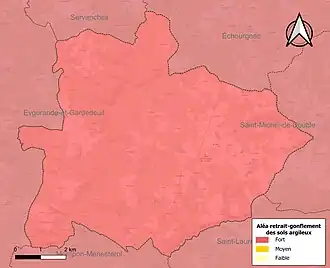 Les mouvements de terrains susceptibles de se produire sur la commune sont des tassements différentiels[43]. Le retrait-gonflement des sols argileux est susceptible d'engendrer des dommages importants aux bâtiments en cas d’alternance de périodes de sécheresse et de pluie[44]. La totalité de la commune est en aléa moyen ou fort (58,6 % au niveau départemental et 48,5 % au niveau national métropolitain)[Carte 4]. Depuis le , en application de la loi ÉLAN, différentes contraintes s'imposent aux vendeurs, maîtres d'ouvrages ou constructeurs de biens situés dans une zone classée en aléa moyen ou fort[Note 4],[45].