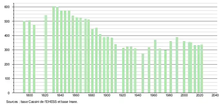 L'évolution du nombre d'habitants est connue à travers les recensements de la population effectués dans la commune depuis 1793. Pour les communes de moins de 10 000 habitants, une enquête de recensement portant sur toute la population est réalisée tous les cinq ans, les populations de référence des années intermédiaires étant quant à elles estimées par interpolation ou extrapolation[26]. Pour la commune, le premier recensement exhaustif entrant dans le cadre du nouveau dispositif a été réalisé en 2008[27].