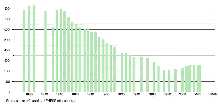 L'évolution du nombre d'habitants est connue à travers les recensements de la population effectués dans la commune depuis 1793. Pour les communes de moins de 10 000 habitants, une enquête de recensement portant sur toute la population est réalisée tous les cinq ans, les populations de référence des années intermédiaires étant quant à elles estimées par interpolation ou extrapolation[25]. Pour la commune, le premier recensement exhaustif entrant dans le cadre du nouveau dispositif a été réalisé en 2004[26].