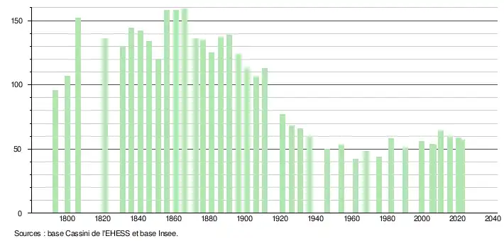 | L'évolution du nombre d'habitants est connue à travers les recensements de la population effectués dans la commune depuis 1793. Pour les communes de moins de 10 000 habitants, une enquête de recensement portant sur toute la population est réalisée tous les cinq ans, les populations de référence des années intermédiaires étant quant à elles estimées par interpolation ou extrapolation[36]. Pour la commune, le premier recensement exhaustif entrant dans le cadre du nouveau dispositif a été réalisé en 2005[37]. En 2022, la commune comptait 57 habitants[Note 6], en évolution de −3,39 % par rapport à 2016 (Ariège : +1,48 %, France hors Mayotte : +2,11 %). |