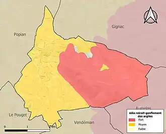 Le retrait-gonflement des sols argileux est susceptible d'engendrer des dommages importants aux bâtiments en cas d’alternance de périodes de sécheresse et de pluie. 99,4 % de la superficie communale est en aléa moyen ou fort (59,3 % au niveau départemental et 48,5 % au niveau national). Sur les 392 bâtiments dénombrés sur la commune en 2019, 392 sont en aléa moyen ou fort, soit 100 %, à comparer aux 85 % au niveau départemental et 54 % au niveau national. Une cartographie de l'exposition du territoire national au retrait gonflement des sols argileux est disponible sur le site du BRGM[14],[Carte 2].