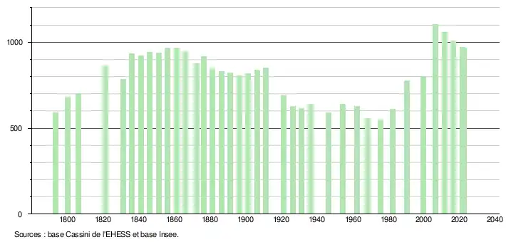 L'évolution du nombre d'habitants est connue à travers les recensements de la population effectués dans la commune depuis 1793. Pour les communes de moins de 10 000 habitants, une enquête de recensement portant sur toute la population est réalisée tous les cinq ans, les populations de référence des années intermédiaires étant quant à elles estimées par interpolation ou extrapolation[25]. Pour la commune, le premier recensement exhaustif entrant dans le cadre du nouveau dispositif a été réalisé en 2006[26].