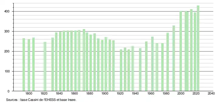 L'évolution du nombre d'habitants est connue à travers les recensements de la population effectués dans la commune depuis 1793. Pour les communes de moins de 10 000 habitants, une enquête de recensement portant sur toute la population est réalisée tous les cinq ans, les populations de référence des années intermédiaires étant quant à elles estimées par interpolation ou extrapolation[22]. Pour la commune, le premier recensement exhaustif entrant dans le cadre du nouveau dispositif a été réalisé en 2008[23].
