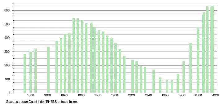 L'évolution du nombre d'habitants est connue à travers les recensements de la population effectués dans la commune depuis 1793. Pour les communes de moins de 10 000 habitants, une enquête de recensement portant sur toute la population est réalisée tous les cinq ans, les populations de référence des années intermédiaires étant quant à elles estimées par interpolation ou extrapolation[4]. Pour la commune, le premier recensement exhaustif entrant dans le cadre du nouveau dispositif a été réalisé en 2005[5].