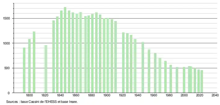 L'évolution du nombre d'habitants est connue à travers les recensements de la population effectués dans la commune depuis 1793. Pour les communes de moins de 10 000 habitants, une enquête de recensement portant sur toute la population est réalisée tous les cinq ans, les populations de référence des années intermédiaires étant quant à elles estimées par interpolation ou extrapolation[24]. Pour la commune, le premier recensement exhaustif entrant dans le cadre du nouveau dispositif a été réalisé en 2008[25].