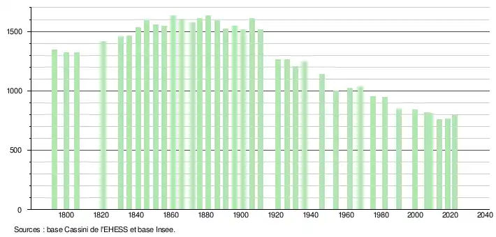 L'évolution du nombre d'habitants est connue à travers les recensements de la population effectués dans la commune depuis 1793. Pour les communes de moins de 10 000 habitants, une enquête de recensement portant sur toute la population est réalisée tous les cinq ans, les populations de référence des années intermédiaires étant quant à elles estimées par interpolation ou extrapolation[15]. Pour la commune, le premier recensement exhaustif entrant dans le cadre du nouveau dispositif a été réalisé en 2008[16].