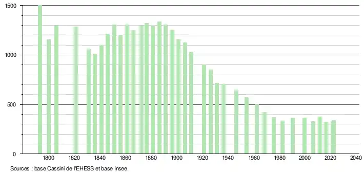 L'évolution du nombre d'habitants est connue à travers les recensements de la population effectués dans la commune depuis 1793. Pour les communes de moins de 10 000 habitants, une enquête de recensement portant sur toute la population est réalisée tous les cinq ans, les populations de référence des années intermédiaires étant quant à elles estimées par interpolation ou extrapolation[15]. Pour la commune, le premier recensement exhaustif entrant dans le cadre du nouveau dispositif a été réalisé en 2006[16].