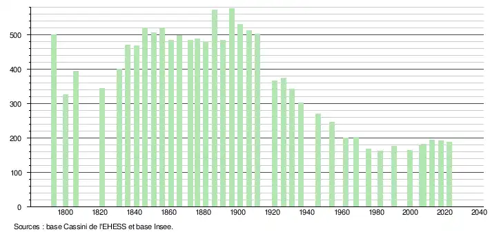 L'évolution du nombre d'habitants est connue à travers les recensements de la population effectués dans la commune depuis 1793. Pour les communes de moins de 10 000 habitants, une enquête de recensement portant sur toute la population est réalisée tous les cinq ans, les populations de référence des années intermédiaires étant quant à elles estimées par interpolation ou extrapolation[18]. Pour la commune, le premier recensement exhaustif entrant dans le cadre du nouveau dispositif a été réalisé en 2007[19].