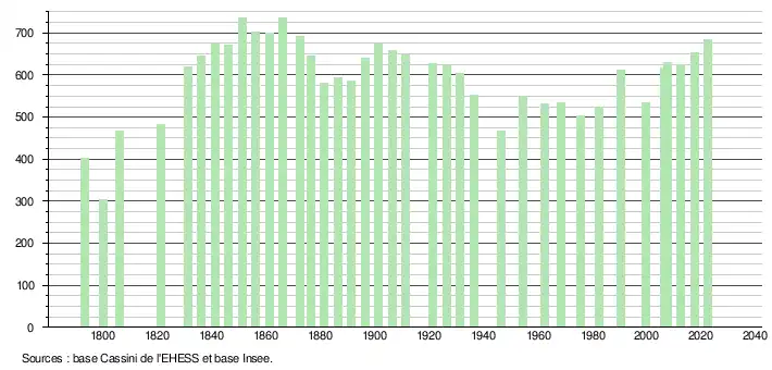L'évolution du nombre d'habitants est connue à travers les recensements de la population effectués dans la commune depuis 1793. Pour les communes de moins de 10 000 habitants, une enquête de recensement portant sur toute la population est réalisée tous les cinq ans, les populations de référence des années intermédiaires étant quant à elles estimées par interpolation ou extrapolation[28]. Pour la commune, le premier recensement exhaustif entrant dans le cadre du nouveau dispositif a été réalisé en 2007[29].