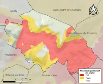 La commune est vulnérable au risque de mouvements de terrains constitué principalement du retrait-gonflement des sols argileux[20]. Cet aléa est susceptible d'engendrer des dommages importants aux bâtiments en cas d’alternance de périodes de sécheresse et de pluie. 75 % de la superficie communale est en aléa moyen ou fort (67,5 % au niveau départemental et 48,5 % au niveau national). Sur les 390 bâtiments dénombrés sur la commune en 2019, 351 sont en aléa moyen ou fort, soit 90 %, à comparer aux 90 % au niveau départemental et 54 % au niveau national. Une cartographie de l'exposition du territoire national au retrait gonflement des sols argileux est disponible sur le site du BRGM[21],[Carte 2].