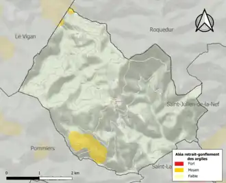 La commune est vulnérable au risque de mouvements de terrains constitué principalement du retrait-gonflement des sols argileux[14]. Cet aléa est susceptible d'engendrer des dommages importants aux bâtiments en cas d’alternance de périodes de sécheresse et de pluie. 4 % de la superficie communale est en aléa moyen ou fort (67,5 % au niveau départemental et 48,5 % au niveau national). Sur les 73 bâtiments dénombrés sur la commune en 2019, 3 sont en aléa moyen ou fort, soit 4 %, à comparer aux 90 % au niveau départemental et 54 % au niveau national. Une cartographie de l'exposition du territoire national au retrait gonflement des sols argileux est disponible sur le site du BRGM[15],[Carte 2].
