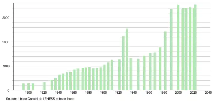 L'évolution du nombre d'habitants est connue à travers les recensements de la population effectués dans la commune depuis 1793. Pour les communes de moins de 10000habitants, une enquête de recensement portant sur toute la population est réalisée tous les cinqans, les populations de référence des années intermédiaires étant quant à elles estimées par interpolation ou extrapolation[48]. Pour la commune, le premier recensement exhaustif entrant dans le cadre du nouveau dispositif a été réalisé en 2005[49].