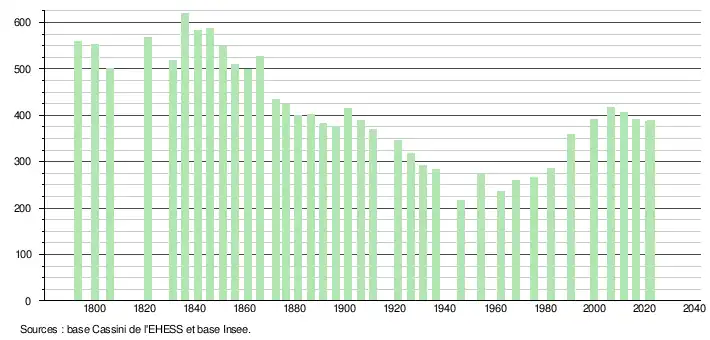 L'évolution du nombre d'habitants est connue à travers les recensements de la population effectués dans la commune depuis 1793. Pour les communes de moins de 10 000 habitants, une enquête de recensement portant sur toute la population est réalisée tous les cinq ans, les populations de référence des années intermédiaires étant quant à elles estimées par interpolation ou extrapolation[16]. Pour la commune, le premier recensement exhaustif entrant dans le cadre du nouveau dispositif a été réalisé en 2006[17].
