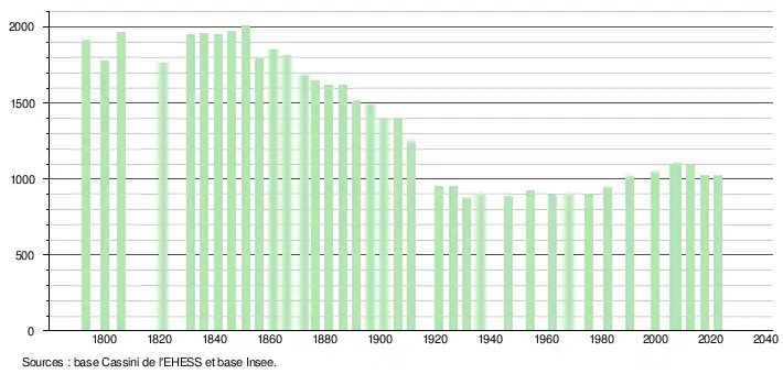 L'évolution du nombre d'habitants est connue à travers les recensements de la population effectués dans la commune depuis 1793. Pour les communes de moins de 10 000 habitants, une enquête de recensement portant sur toute la population est réalisée tous les cinq ans, les populations de référence des années intermédiaires étant quant à elles estimées par interpolation ou extrapolation[42]. Pour la commune, le premier recensement exhaustif entrant dans le cadre du nouveau dispositif a été réalisé en 2007[43].