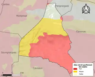 Le retrait-gonflement des sols argileux est susceptible d'engendrer des dommages importants aux bâtiments en cas d’alternance de périodes de sécheresse et de pluie. 90,2% de la superficie communale est en aléa moyen ou fort (67,5% au niveau départemental et 48,5% au niveau national). Sur les 328 bâtiments dénombrés sur la commune en 2019, 324 sont en aléa moyen ou fort, soit 99%, à comparer aux 90% au niveau départemental et 54% au niveau national. Une cartographie de l'exposition du territoire national au retrait gonflement des sols argileux est disponible sur le site du BRGM[14],[Carte 2].