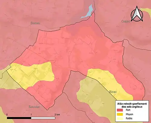 Le retrait-gonflement des sols argileux est susceptible d'engendrer des dommages importants aux bâtiments en cas d’alternance de périodes de sécheresse et de pluie. La totalité de la commune est en aléa moyen ou fort (67,4 % au niveau départemental et 48,5 % au niveau national). Sur les 144 bâtiments dénombrés sur la commune en 2019, 144 sont en aléa moyen ou fort, soit 100 %, à comparer aux 84 % au niveau départemental et 54 % au niveau national. Une cartographie de l'exposition du territoire national au retrait gonflement des sols argileux est disponible sur le site du BRGM[20],[Carte 2].