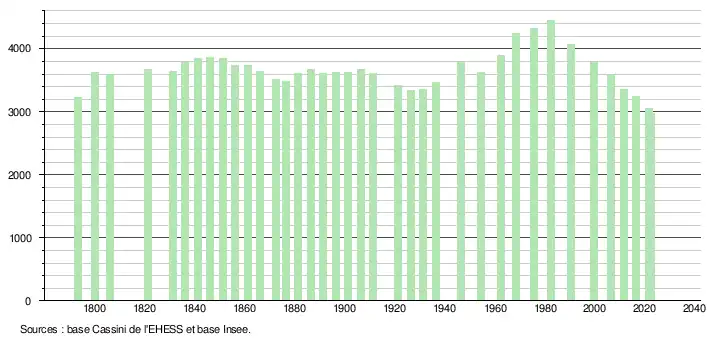 L'évolution du nombre d'habitants est connue à travers les recensements de la population effectués dans la commune depuis 1793. Pour les communes de moins de 10 000 habitants, une enquête de recensement portant sur toute la population est réalisée tous les cinq ans, les populations de référence des années intermédiaires étant quant à elles estimées par interpolation ou extrapolation[25]. Pour la commune, le premier recensement exhaustif entrant dans le cadre du nouveau dispositif a été réalisé en 2006[26].