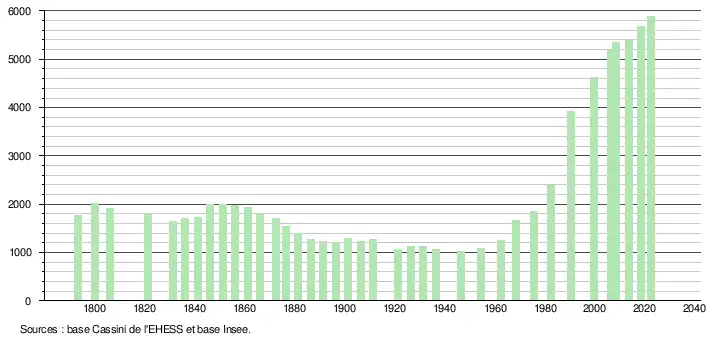 L'évolution du nombre d'habitants est connue à travers les recensements de la population effectués dans la commune depuis 1793. Pour les communes de moins de 10 000 habitants, une enquête de recensement portant sur toute la population est réalisée tous les cinq ans, les populations de référence des années intermédiaires étant quant à elles estimées par interpolation ou extrapolation[24]. Pour la commune, le premier recensement exhaustif entrant dans le cadre du nouveau dispositif a été réalisé en 2008[25].