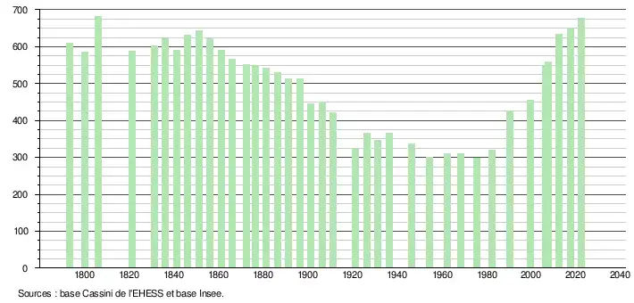 L'évolution du nombre d'habitants est connue à travers les recensements de la population effectués dans la commune depuis 1793. Pour les communes de moins de 10 000 habitants, une enquête de recensement portant sur toute la population est réalisée tous les cinq ans, les populations de référence des années intermédiaires étant quant à elles estimées par interpolation ou extrapolation[24]. Pour la commune, le premier recensement exhaustif entrant dans le cadre du nouveau dispositif a été réalisé en 2007[25].