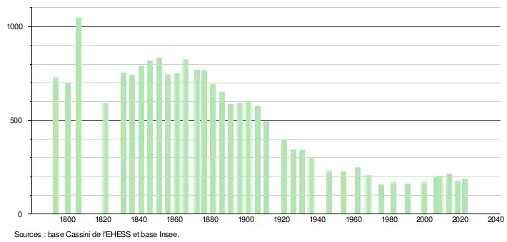 L'évolution du nombre d'habitants est connue à travers les recensements de la population effectués dans la commune depuis 1793. Pour les communes de moins de 10 000 habitants, une enquête de recensement portant sur toute la population est réalisée tous les cinq ans, les populations de référence des années intermédiaires étant quant à elles estimées par interpolation ou extrapolation[30]. Pour la commune, le premier recensement exhaustif entrant dans le cadre du nouveau dispositif a été réalisé en 2008[31].