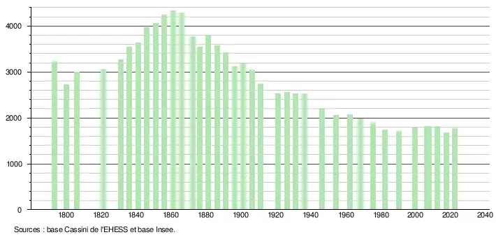 L'évolution du nombre d'habitants est connue à travers les recensements de la population effectués dans la commune depuis 1793. Pour les communes de moins de 10 000 habitants, une enquête de recensement portant sur toute la population est réalisée tous les cinq ans, les populations de référence des années intermédiaires étant quant à elles estimées par interpolation ou extrapolation[31]. Pour la commune, le premier recensement exhaustif entrant dans le cadre du nouveau dispositif a été réalisé en 2007[32].