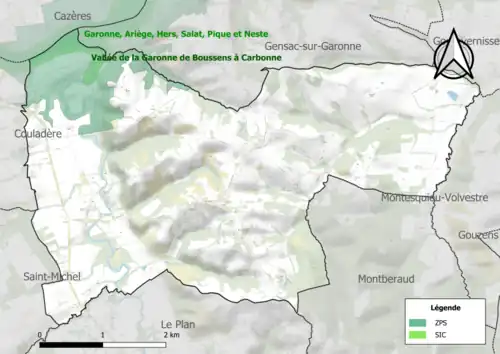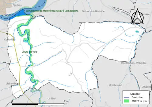 L’inventaire des zones naturelles d'intérêt écologique, faunistique et floristique (ZNIEFF) a pour objectif de réaliser une couverture des zones les plus intéressantes sur le plan écologique, essentiellement dans la perspective d’améliorer la connaissance du patrimoine naturel national et de fournir aux différents décideurs un outil d’aide à la prise en compte de l’environnement dans l’aménagement du territoire. Deux ZNIEFF de type 1[Note 2] sont recensées sur la commune[24] : le « cours du Volp » (205 ha), couvrant 15 communes dont 11 dans l'Ariège et quatre dans la Haute-Garonne[25] et « la Garonne de Montréjeau jusqu'à Lamagistère » (5 075 ha), couvrant 92 communes dont 63 dans la Haute-Garonne, trois dans le Lot-et-Garonne et 26 dans le Tarn-et-Garonne[26] et une ZNIEFF de type 2[Note 3],[24] : « la Garonne et milieux riverains, en aval de Montréjeau » (6 874 ha), couvrant 93 communes dont 64 dans la Haute-Garonne, trois dans le Lot-et-Garonne et 26 dans le Tarn-et-Garonne[27].
