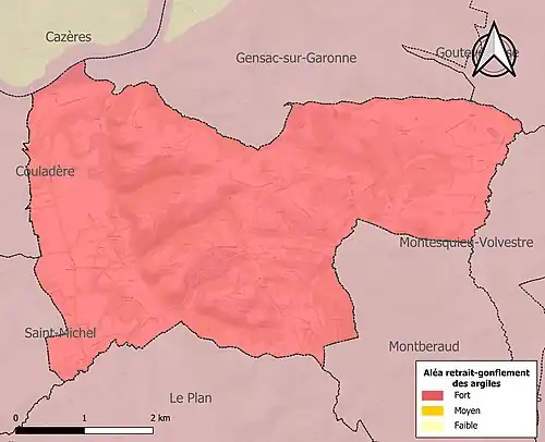 La commune est vulnérable au risque de mouvements de terrains constitué principalement du retrait-gonflement des sols argileux[34]. Cet aléa est susceptible d'engendrer des dommages importants aux bâtiments en cas d’alternance de périodes de sécheresse et de pluie. La totalité de la commune est en aléa moyen ou fort (88,8 % au niveau départemental et 48,5 % au niveau national). Sur les 131 bâtiments dénombrés sur la commune en 2019, 131 sont en aléa moyen ou fort, soit 100 %, à comparer aux 98 % au niveau départemental et 54 % au niveau national. Une cartographie de l'exposition du territoire national au retrait gonflement des sols argileux est disponible sur le site du BRGM[35],[Carte 3].