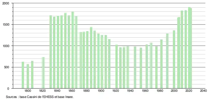 L'évolution du nombre d'habitants est connue à travers les recensements de la population effectués dans la commune depuis 1793. Pour les communes de moins de 10 000 habitants, une enquête de recensement portant sur toute la population est réalisée tous les cinq ans, les populations de référence des années intermédiaires étant quant à elles estimées par interpolation ou extrapolation[18]. Pour la commune, le premier recensement exhaustif entrant dans le cadre du nouveau dispositif a été réalisé en 2005[19].