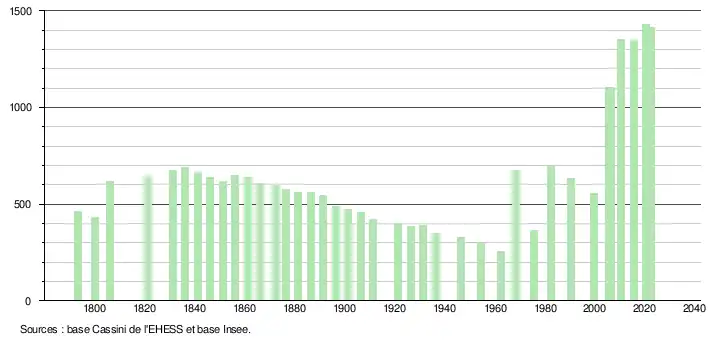 - ↑ Fiches Insee - Populations de référence de la commune pour les années 2006, 2007, 2008, 2009, 2010, 2011, 2012, 2013, 2014, 2015, 2016, 2017, 2018, 2019, 2020, 2021 et 2022.