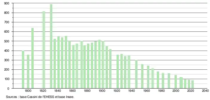 L'évolution du nombre d'habitants est connue à travers les recensements de la population effectués dans la commune depuis 1793. Pour les communes de moins de 10 000 habitants, une enquête de recensement portant sur toute la population est réalisée tous les cinq ans, les populations de référence des années intermédiaires étant quant à elles estimées par interpolation ou extrapolation[20]. Pour la commune, le premier recensement exhaustif entrant dans le cadre du nouveau dispositif a été réalisé en 2007[21].