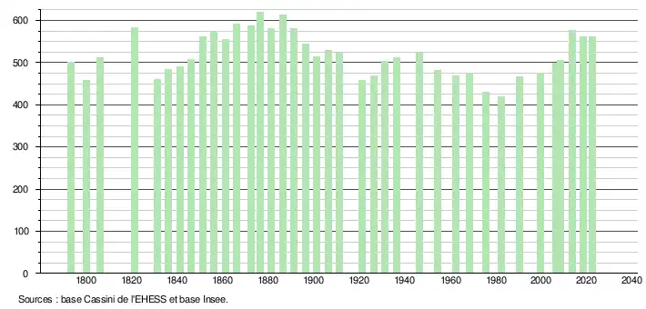 - ↑ Population municipale de référence en vigueur au 1er janvier 2025, millésimée 2022, définie dans les limites territoriales en vigueur au 1er janvier 2024, date de référence statistique : 1er janvier 2022.