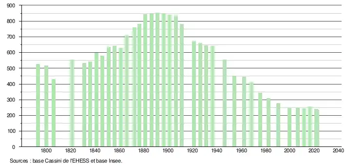L'évolution du nombre d'habitants est connue à travers les recensements de la population effectués dans la commune depuis 1793. Pour les communes de moins de 10 000 habitants, une enquête de recensement portant sur toute la population est réalisée tous les cinq ans, les populations de référence des années intermédiaires étant quant à elles estimées par interpolation ou extrapolation[26]. Pour la commune, le premier recensement exhaustif entrant dans le cadre du nouveau dispositif a été réalisé en 2006[27].