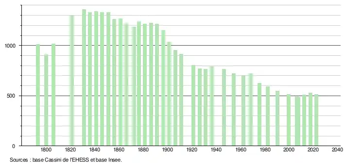 L'évolution du nombre d'habitants est connue à travers les recensements de la population effectués dans la commune depuis 1793. Pour les communes de moins de 10 000 habitants, une enquête de recensement portant sur toute la population est réalisée tous les cinq ans, les populations de référence des années intermédiaires étant quant à elles estimées par interpolation ou extrapolation[19]. Pour la commune, le premier recensement exhaustif entrant dans le cadre du nouveau dispositif a été réalisé en 2007[20].