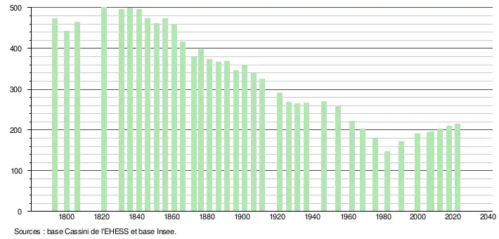 L'évolution du nombre d'habitants est connue à travers les recensements de la population effectués dans la commune depuis 1793. Pour les communes de moins de 10 000 habitants, une enquête de recensement portant sur toute la population est réalisée tous les cinq ans, les populations de référence des années intermédiaires étant quant à elles estimées par interpolation ou extrapolation[15]. Pour la commune, le premier recensement exhaustif entrant dans le cadre du nouveau dispositif a été réalisé en 2007[16].