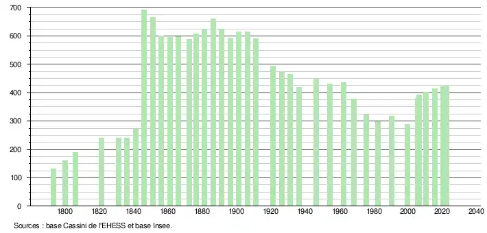 L'évolution du nombre d'habitants est connue à travers les recensements de la population effectués dans la commune depuis 1793. Pour les communes de moins de 10 000 habitants, une enquête de recensement portant sur toute la population est réalisée tous les cinq ans, les populations de référence des années intermédiaires étant quant à elles estimées par interpolation ou extrapolation[17]. Pour la commune, le premier recensement exhaustif entrant dans le cadre du nouveau dispositif a été réalisé en 2005[18].