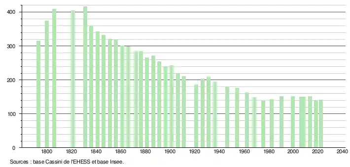 L'évolution du nombre d'habitants est connue à travers les recensements de la population effectués dans la commune depuis 1793. Pour les communes de moins de 10 000 habitants, une enquête de recensement portant sur toute la population est réalisée tous les cinq ans, les populations de référence des années intermédiaires étant quant à elles estimées par interpolation ou extrapolation[20]. Pour la commune, le premier recensement exhaustif entrant dans le cadre du nouveau dispositif a été réalisé en 2008[21].