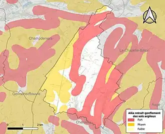 Les mouvements de terrains susceptibles de se produire sur la commune sont des tassements différentiels[16]. Le retrait-gonflement des sols argileux est susceptible d'engendrer des dommages importants aux bâtiments en cas d’alternance de périodes de sécheresse et de pluie[17]. 71,6 % de la superficie communale est en aléa moyen ou fort (54,9 % au niveau départemental et 48,5 % au niveau national)[Carte 2]. Depuis le , en application de la loi ELAN, différentes contraintes s'imposent aux vendeurs, maîtres d'ouvrages ou constructeurs de biens situés dans une zone classée en aléa moyen ou fort[Note 2],[18].