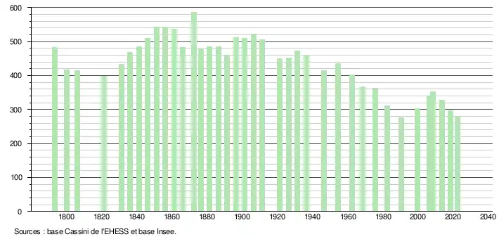 L'évolution du nombre d'habitants est connue à travers les recensements de la population effectués dans la commune depuis 1793. Pour les communes de moins de 10 000 habitants, une enquête de recensement portant sur toute la population est réalisée tous les cinq ans, les populations de référence des années intermédiaires étant quant à elles estimées par interpolation ou extrapolation[19]. Pour la commune, le premier recensement exhaustif entrant dans le cadre du nouveau dispositif a été réalisé en 2008[20].