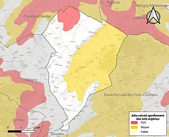 Les mouvements de terrains susceptibles de se produire sur la commune sont des tassements différentiels[15]. Le retrait-gonflement des sols argileux est susceptible d'engendrer des dommages importants aux bâtiments en cas d’alternance de périodes de sécheresse et de pluie[16]. 50,5 % de la superficie communale est en aléa moyen ou fort (79,5 % au niveau départemental et 48,5 % au niveau national)[Carte 2]. Depuis le , en application de la loi ÉLAN, différentes contraintes s'imposent aux vendeurs, maîtres d'ouvrages ou constructeurs de biens situés dans une zone classée en aléa moyen ou fort[Note 2],[17].