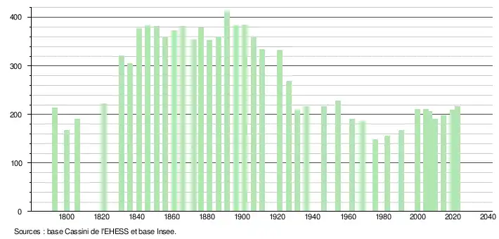 L'évolution du nombre d'habitants est connue à travers les recensements de la population effectués dans la commune depuis 1793. Pour les communes de moins de 10 000 habitants, une enquête de recensement portant sur toute la population est réalisée tous les cinq ans, les populations de référence des années intermédiaires étant quant à elles estimées par interpolation ou extrapolation[17]. Pour la commune, le premier recensement exhaustif entrant dans le cadre du nouveau dispositif a été réalisé en 2004[18].