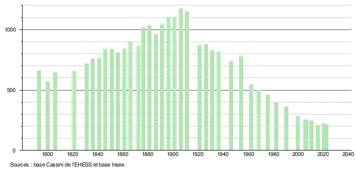 L'évolution du nombre d'habitants est connue à travers les recensements de la population effectués dans la commune depuis 1793. Pour les communes de moins de 10 000 habitants, une enquête de recensement portant sur toute la population est réalisée tous les cinq ans, les populations de référence des années intermédiaires étant quant à elles estimées par interpolation ou extrapolation[19]. Pour la commune, le premier recensement exhaustif entrant dans le cadre du nouveau dispositif a été réalisé en 2005[20].