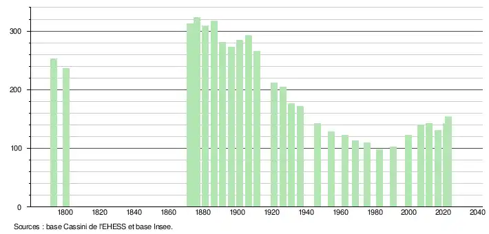 L'évolution du nombre d'habitants est connue à travers les recensements de la population effectués dans la commune depuis 1793. Pour les communes de moins de 10 000 habitants, une enquête de recensement portant sur toute la population est réalisée tous les cinq ans, les populations de référence des années intermédiaires étant quant à elles estimées par interpolation ou extrapolation[28]. Pour la commune, le premier recensement exhaustif entrant dans le cadre du nouveau dispositif a été réalisé en 2006[29].