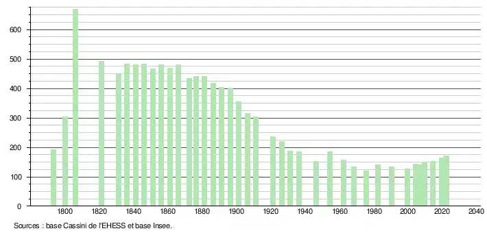 L'évolution du nombre d'habitants est connue à travers les recensements de la population effectués dans la commune depuis 1793. Pour les communes de moins de 10 000 habitants, une enquête de recensement portant sur toute la population est réalisée tous les cinq ans, les populations de référence des années intermédiaires étant quant à elles estimées par interpolation ou extrapolation[28]. Pour la commune, le premier recensement exhaustif entrant dans le cadre du nouveau dispositif a été réalisé en 2004[29].