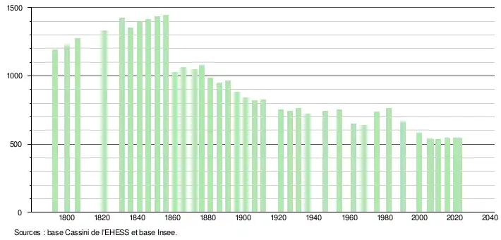 L'évolution du nombre d'habitants est connue à travers les recensements de la population effectués dans la commune depuis 1793. Pour les communes de moins de 10 000 habitants, une enquête de recensement portant sur toute la population est réalisée tous les cinq ans, les populations de référence des années intermédiaires étant quant à elles estimées par interpolation ou extrapolation[56]. Pour la commune, le premier recensement exhaustif entrant dans le cadre du nouveau dispositif a été réalisé en 2005[57].