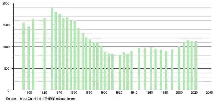 L'évolution du nombre d'habitants est connue à travers les recensements de la population effectués dans la commune depuis 1793. Pour les communes de moins de 10 000 habitants, une enquête de recensement portant sur toute la population est réalisée tous les cinq ans, les populations de référence des années intermédiaires étant quant à elles estimées par interpolation ou extrapolation[20]. Pour la commune, le premier recensement exhaustif entrant dans le cadre du nouveau dispositif a été réalisé en 2006[21].