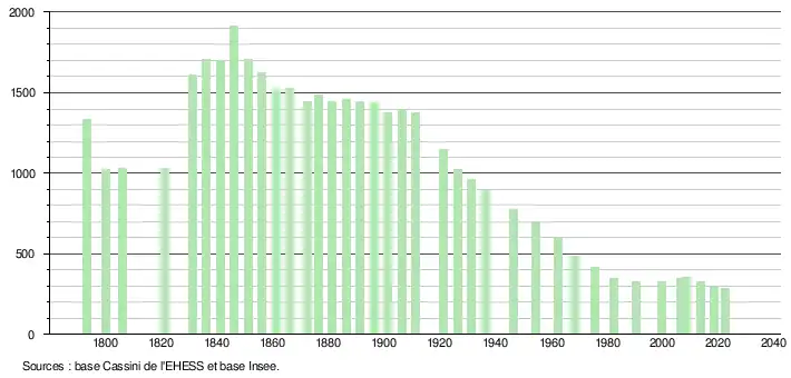L'évolution du nombre d'habitants est connue à travers les recensements de la population effectués dans la commune depuis 1793. Pour les communes de moins de 10 000 habitants, une enquête de recensement portant sur toute la population est réalisée tous les cinq ans, les populations de référence des années intermédiaires étant quant à elles estimées par interpolation ou extrapolation[28]. Pour la commune, le premier recensement exhaustif entrant dans le cadre du nouveau dispositif a été réalisé en 2008[29].