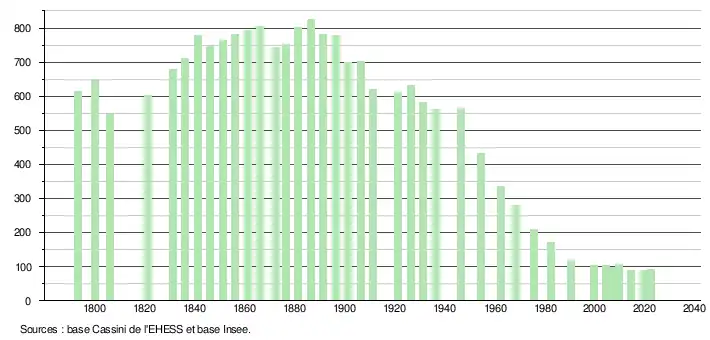 L'évolution du nombre d'habitants est connue à travers les recensements de la population effectués dans la commune depuis 1793. Pour les communes de moins de 10000habitants, une enquête de recensement portant sur toute la population est réalisée tous les cinqans, les populations de référence des années intermédiaires étant quant à elles estimées par interpolation ou extrapolation[17]. Pour la commune, le premier recensement exhaustif entrant dans le cadre du nouveau dispositif a été réalisé en 2004[18].