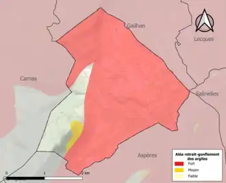 Le retrait-gonflement des sols argileux est susceptible d'engendrer des dommages importants aux bâtiments en cas d’alternance de périodes de sécheresse et de pluie. 85 % de la superficie communale est en aléa moyen ou fort (67,5 % au niveau départemental et 48,5 % au niveau national). Sur les 171 bâtiments dénombrés sur la commune en 2019, 171 sont en aléa moyen ou fort, soit 100 %, à comparer aux 90 % au niveau départemental et 54 % au niveau national. Une cartographie de l'exposition du territoire national au retrait gonflement des sols argileux est disponible sur le site du BRGM[14],[15].